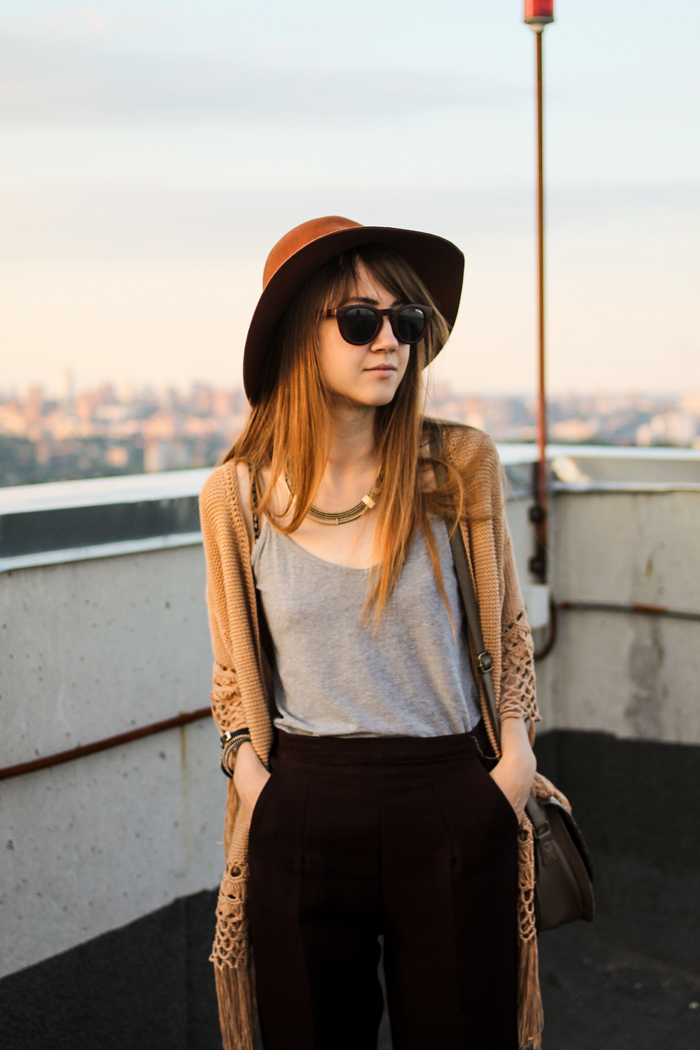 If you remember my What to Wear in Summer post you know that I advised you to wear spaghetti strap tops and oversized pants. And you see, I apply those recommendations in my life:) I added a fringe cardigan and a hat for a very nice evening on the roof:)